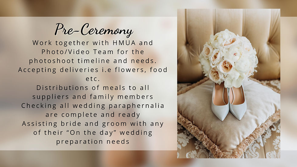An on-the-day wedding coordinator is engaged to work on behalf of the wedding couple to bring together the wedding day they have planned, so they can relax and enjoy the lead up and day of their wedding without any stress.